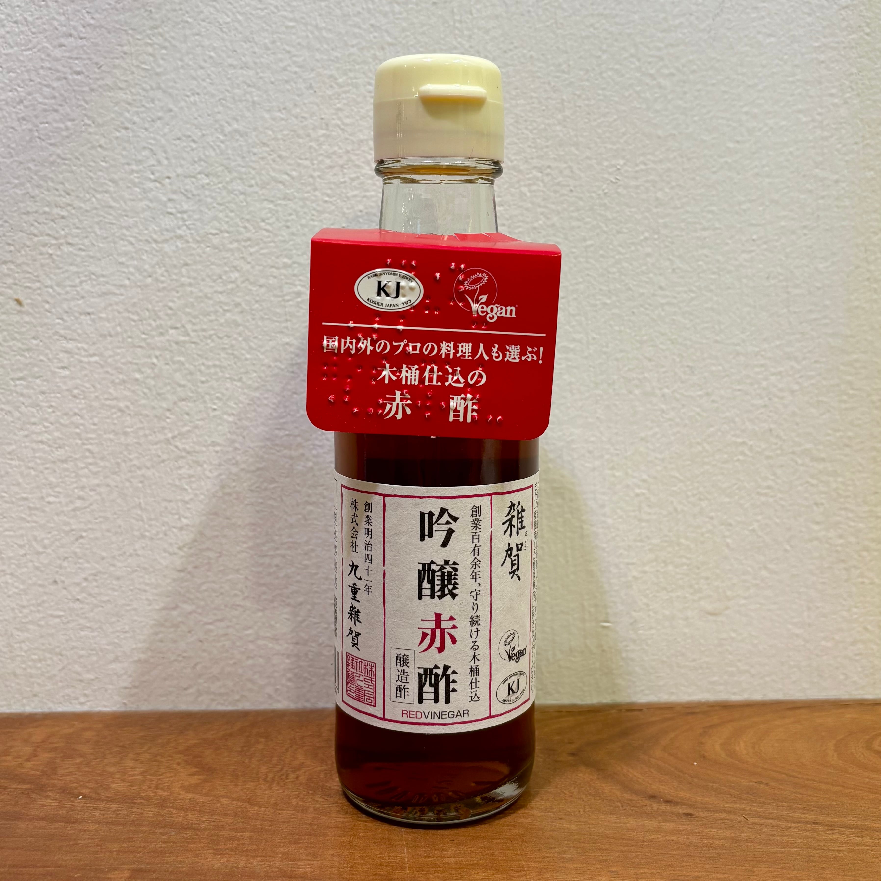 酒造部門で製造した山田錦100%の純米大吟醸酒粕を、1年間以上、熟成させ、その酒粕に酒造部門で製造した純米酒を加え、三十石大木桶で静置発酵させた赤酢です。この無添加赤酢は「雑賀」を醸し出す酒造場杜氏と、「九重酢」を醸し出す食酢工場長が協同で素材を吟味し、お互いの技術を駆使し、精魂込めて醸し出した逸品です。